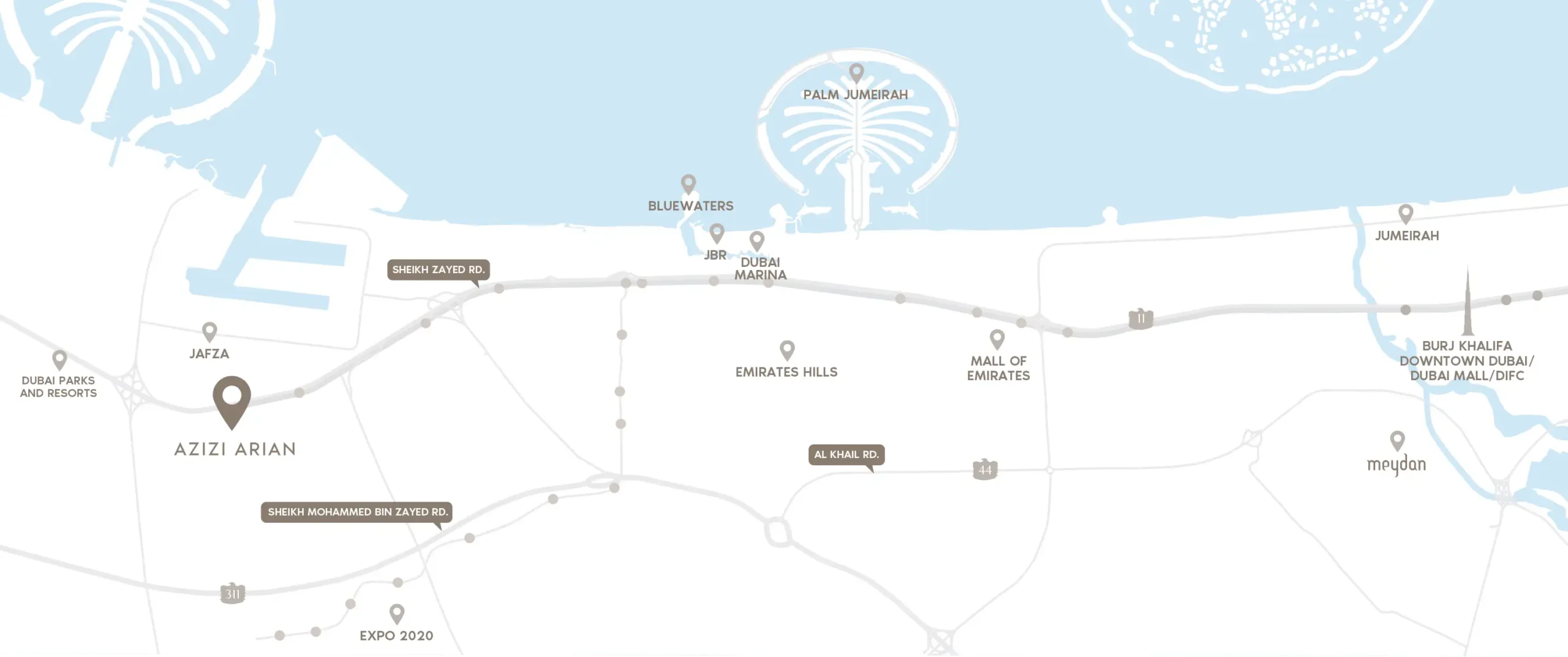 Azizi Aryan at Jebel Ali is an extraordinary residential development, crafted by renowned Azizi Developments lined with studios, 1, 2 and 3-bedroom apartments in Dubai. Offering an exceptional fusion of elegance and functionality, this is one of the rare freehold properties in JAFZA, Dubai’s premier business and logistics zone. With its strategic location in proximity to the Middle East’s largest port and seamless access to key highways and the metro, the façade represents the pinnacle of urban living in one of the region’s most dynamic communities.