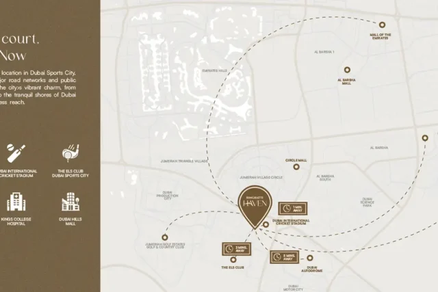 • Strategically situated in Dubai Sports City, it provides seamless access to major road networks, public transportation, and key landmarks such as Burj Khalifa, and Dubai Marina.
