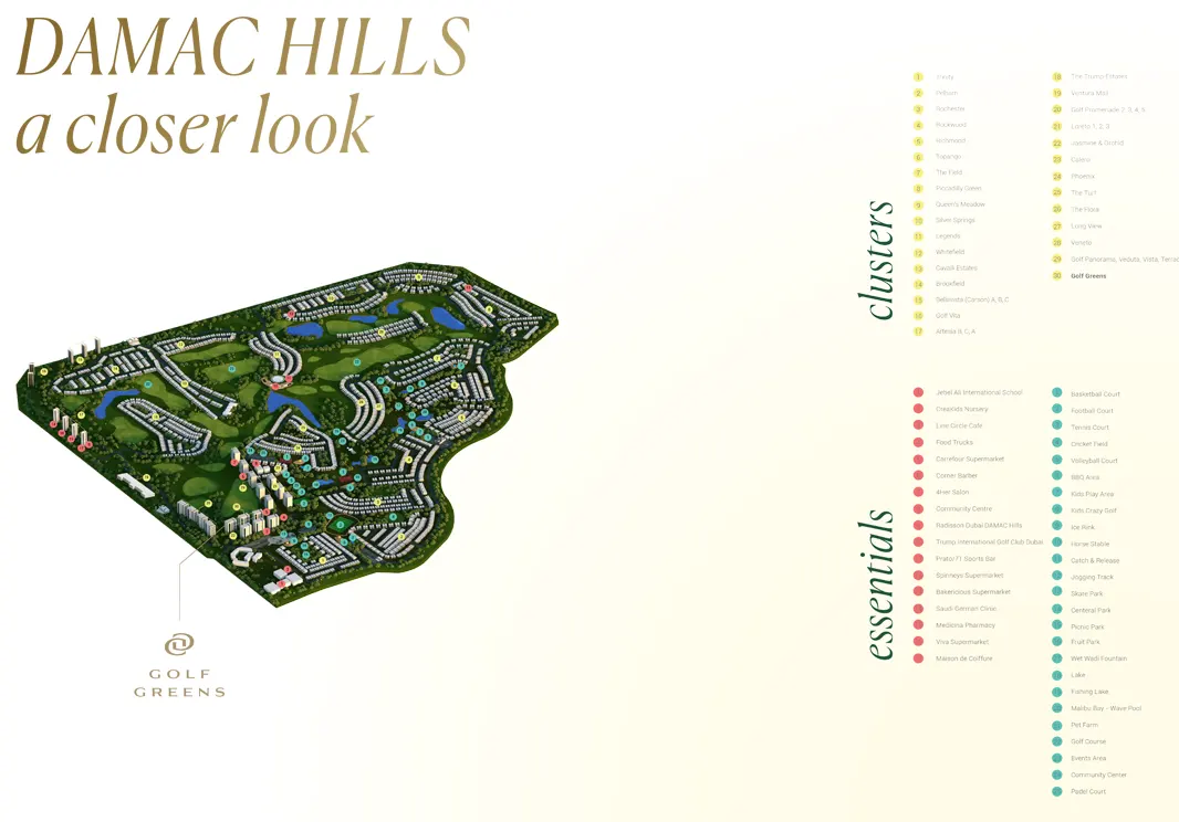 Golf Greens at Damac HillsDubai is an exceptional residential Twin Tower by Damac Properties with luxurious and elegant 1 & 2 bedroom apartments and 2 & 3 bedroom townhouses. This high-rise 20-storey development of towers A and B comes with astonishing infrastructure ornamented with some greenery in it. This lavish creation is the hub of many required and leisure-based amenities and services along with the stunning vistas of the lush green and Trump International Golf Course.