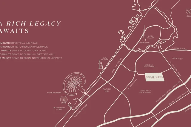 Situated minutes away from Downtown Dubai, offers easy access to key landmarks, including Meydan Racetrack, Dubai International Airport, and major highways.
