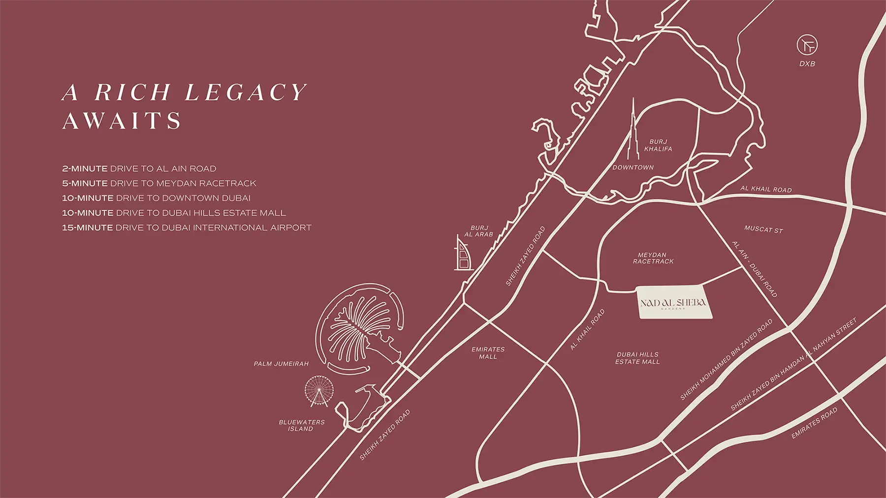 Situated minutes away from Downtown Dubai, offers easy access to key landmarks, including Meydan Racetrack, Dubai International Airport, and major highways.