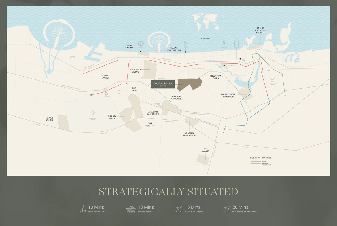 - Close to the exclusive shopping, leisure, and entertainment centre of Dubai Hills Mall and a Dubai Hills Business Park just moments away for professionals