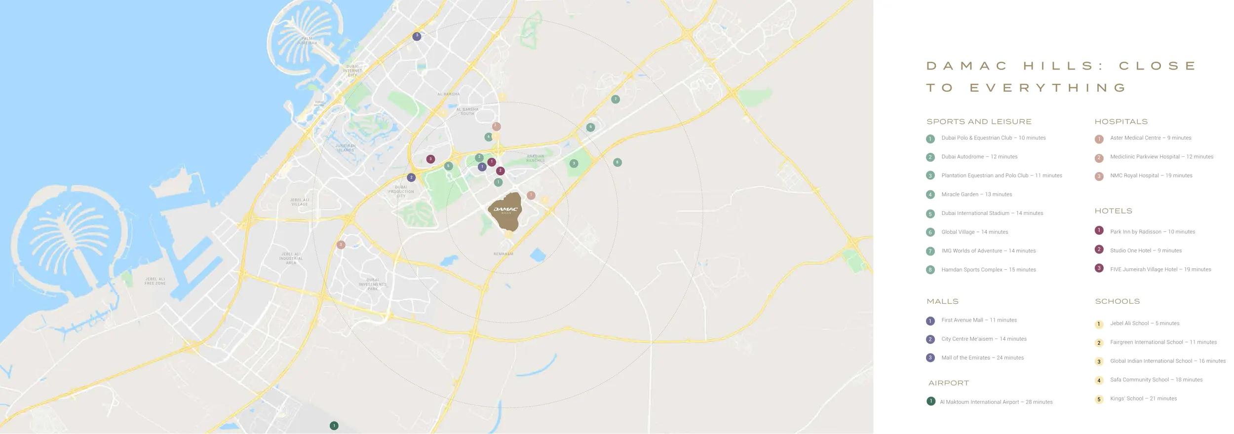 - Nestled within Damac Hills, offers a secluded haven of tranquility, ensuring privacy amidst expansive luxury.